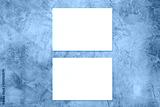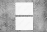Two empty white horizontal rectangle a5 sized card mockups with soft shadows on dark grey concrete wall background. Flat lay, top view