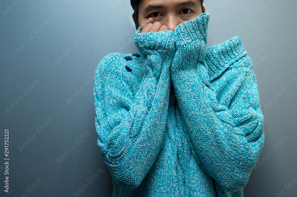 black eyes of Asia woman in bright blue warm knitting sweater on gray background