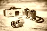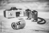 Closeup of a film photography roll with vintage camera. Shallow depth of field. Retro look effect.