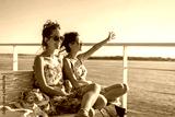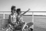 Two young women girl friends or sisters sitting on the bench on the deck of the ferry boat or ship sailing to the island tourist destination on summer vacation waving to the horizon in sunny day