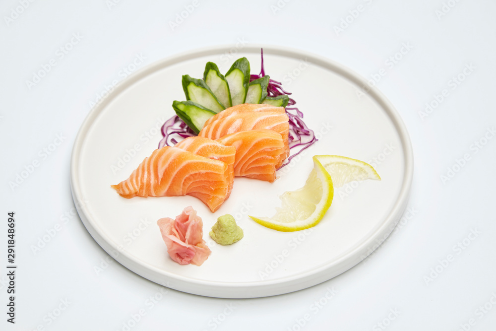 Salmon sashimi set in white plate on white background. Delicious Japanese sashimi set.