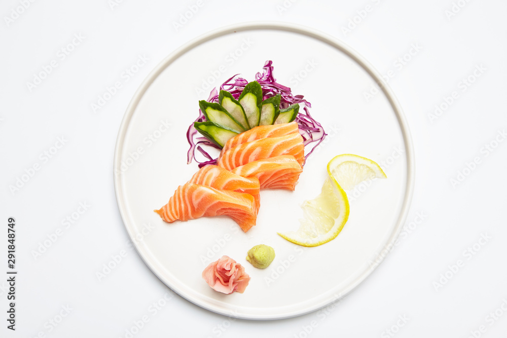 Salmon sashimi set in white plate on white background. Delicious Japanese sashimi set.