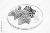 Salmon sashimi set in white plate on white background. Delicious Japanese sashimi set.