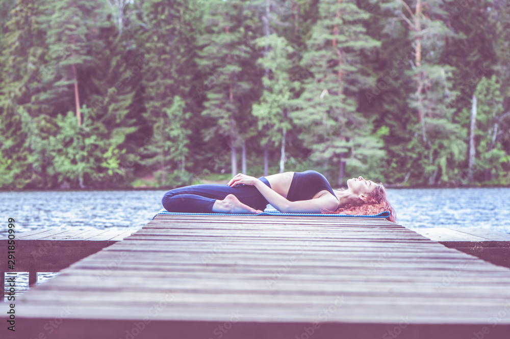 Young yogi girl practicing yoga, Reclining Hero exercise, Virasana pose on the lake. The concept of appeasement, healthy lifestyle.