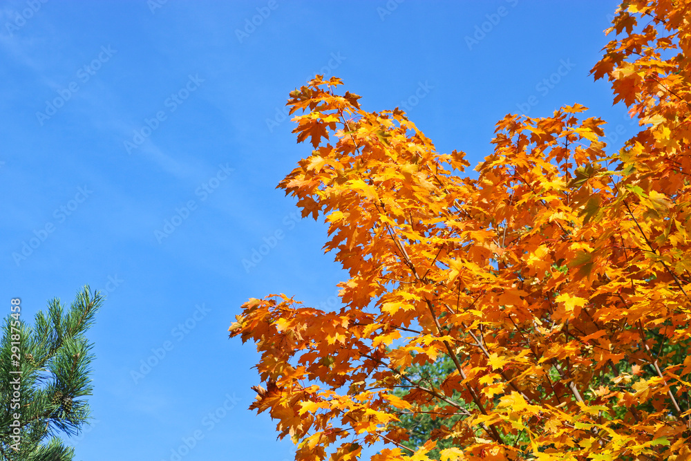 Autumn background - bright yellow leaves of Canadian maple against a blue sky. Indian summer.