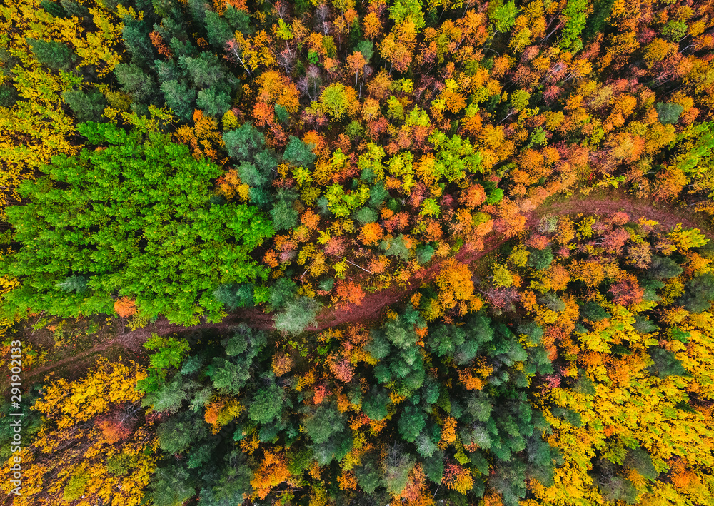 Beautiful autumn forest with yellow and red trees, aerial top view