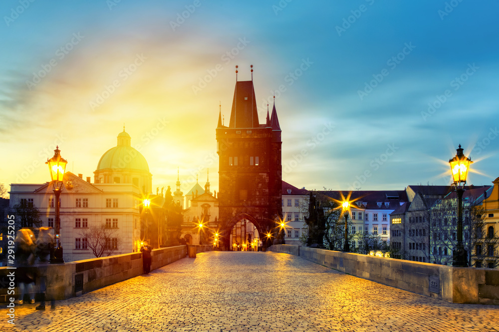 Charles Bridge Karluv Most and Old Town Tower at amazing sunrise with sky and clouds in Prague, Czech Republic.