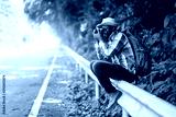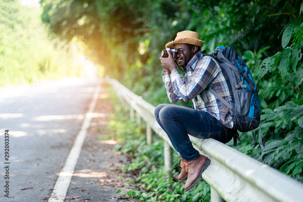 African man traveler carrying backpack and holding camera side the highway road