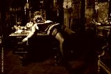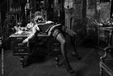 Crime scene imitation. Strangled chambermaid lying on the table..