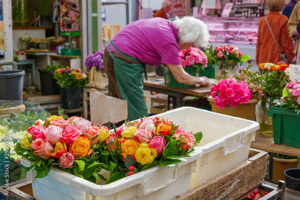 Selected focus at various bouquet of colourful rose and blooming flowers in plastic boxes and blur background of working elder woman florist merchant work at flower stall or outdoor floral shop.