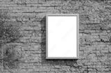 Blank white mock up template of poster with steel frame on old brick wall. Background texture for information/advertisement board.
