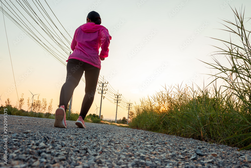 Along the road in the hillside area at the time of the sun set woman is exercising by running.