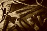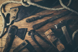old rusty hand tools on wooden plank background. top view