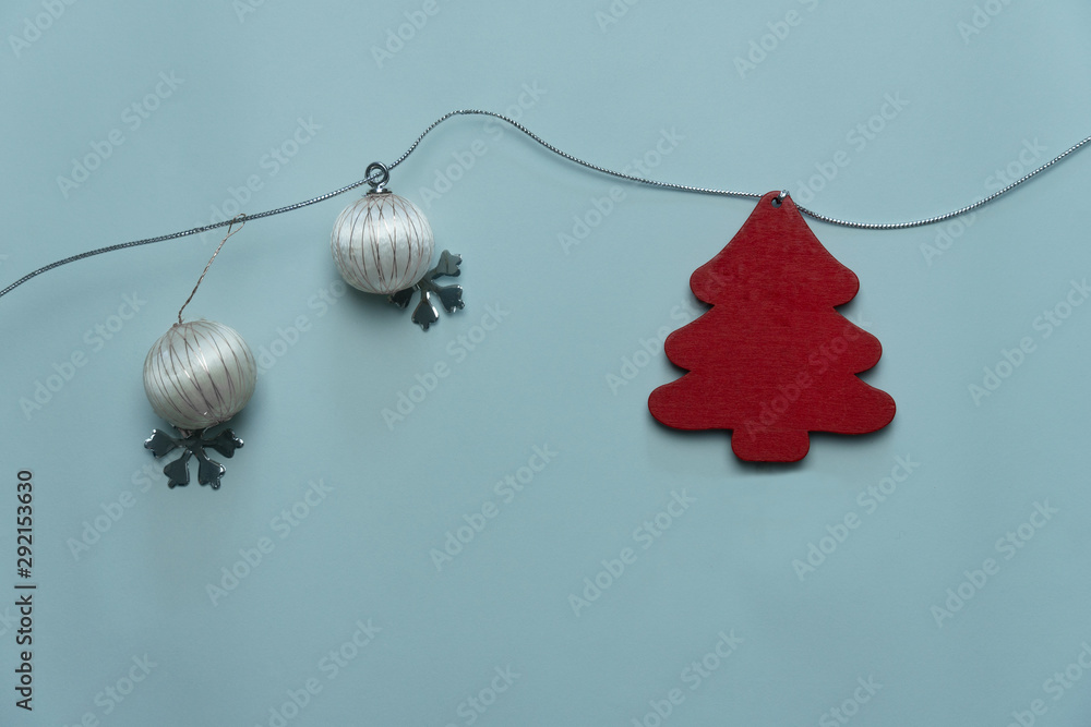 red wood ornamental Christmas tree and white ball silver snowflake for greeting season on blue background