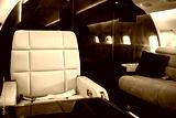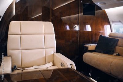 Private jet plane interior with leather seats. Cozy and comfortable seats at the luxury transfer private plane