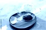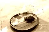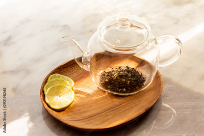 Welding of black tea in a glass teapot. Tea Party with Honey and Lime