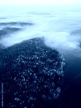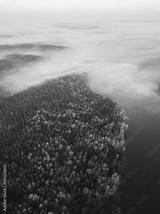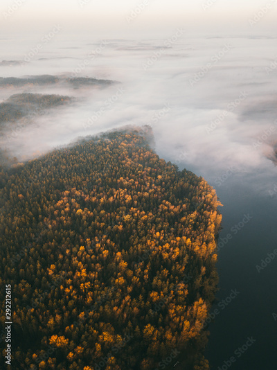 Amazing aerial view of blue foggy river and colorful forest on sunrise. Autumn landscape. Drone shot