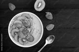 Smoothies bowl with banana, kiwi,frozen strawberry and bee pollenon the black wooden background.Top view.Copy space.