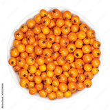 Firethorn fruits in white bowl. Fresh and ripe orange colored seeds of Pyracantha. The fruit can be made into jelly. Bird food. Closeup, from above, on white background, isolated macro food photo.