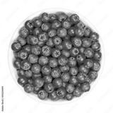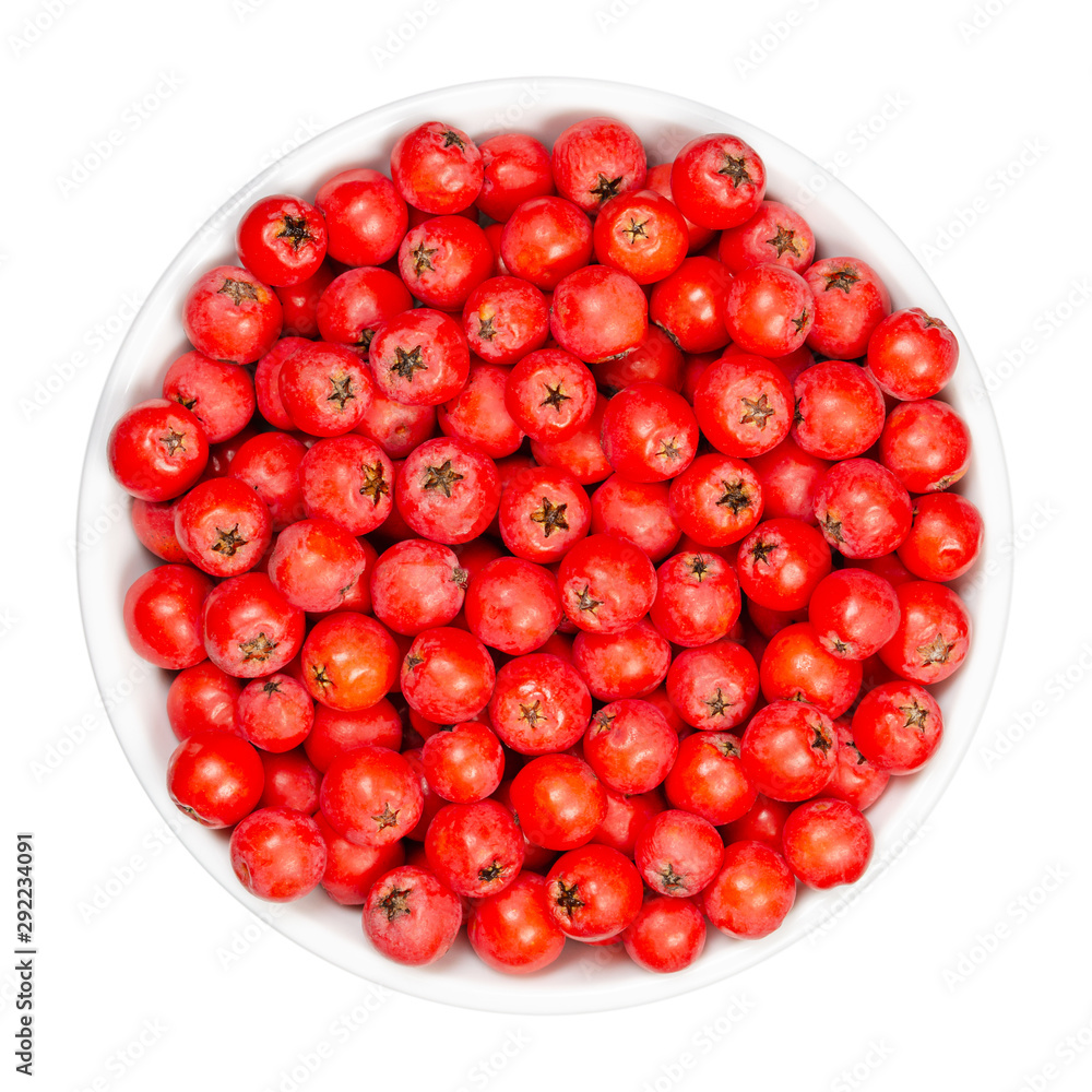European rowan fruits in white bowl. Fresh ripe red seeds. Sorbus aucuparia, also mountain-ash. Fruits are used for jam or liqueur. Closeup, from above, on white background, isolated macro food photo.