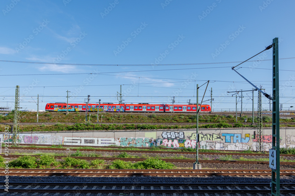 Outdoor sunny view of red train with graffiti from DB, Deutsche Bahn German train company, run on railroad and foreground of railways in Cologne, Germany.