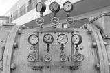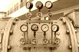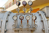Close up view of old rusty damaged metal meter, valve tube system and gas or liquid tank for industry. Detail of broken circular measurement meter with rusty dial.