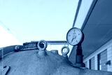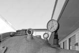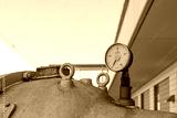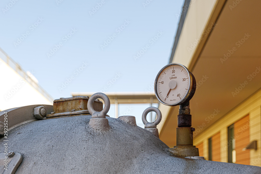 Close up view of old rusty damaged metal meter, valve tube system and gas or liquid tank for industry. Detail of broken circular measurement meter with rusty dial.