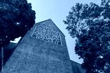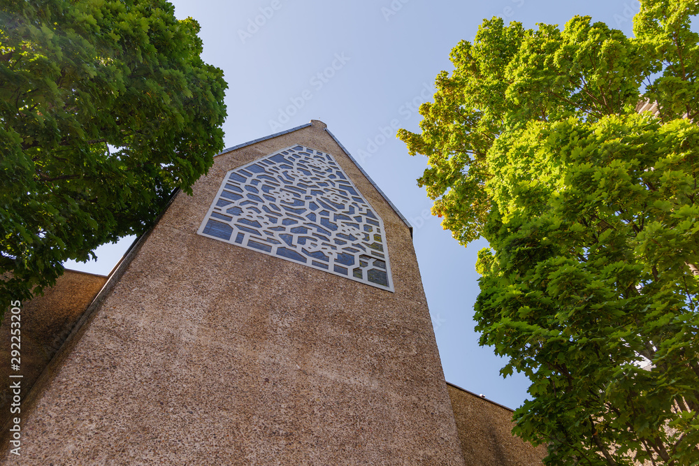 Low angle sunny view of tree grow between exterior sandstone concrete facade with abstract pattern ornament decorate on windows of brutalist architecture church in Cologne, Germany.