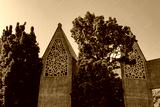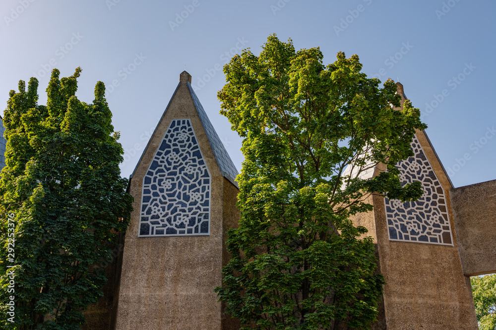 Outdoor sunny view of tree grow between exterior sandstone concrete facade with abstract pattern ornament decorate on windows of brutalist architecture church in Cologne, Germany.