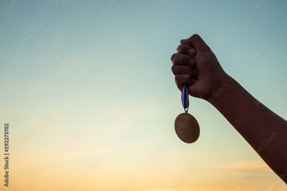 Concepts of victory, success, Hands with an award winning medal on beautiful sunset sky background.