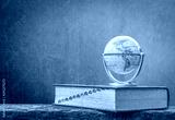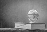 Global education, study aboard, international educational academic program for student concept with world globe, textbook and black school teacher chalkboard background with copy space
