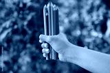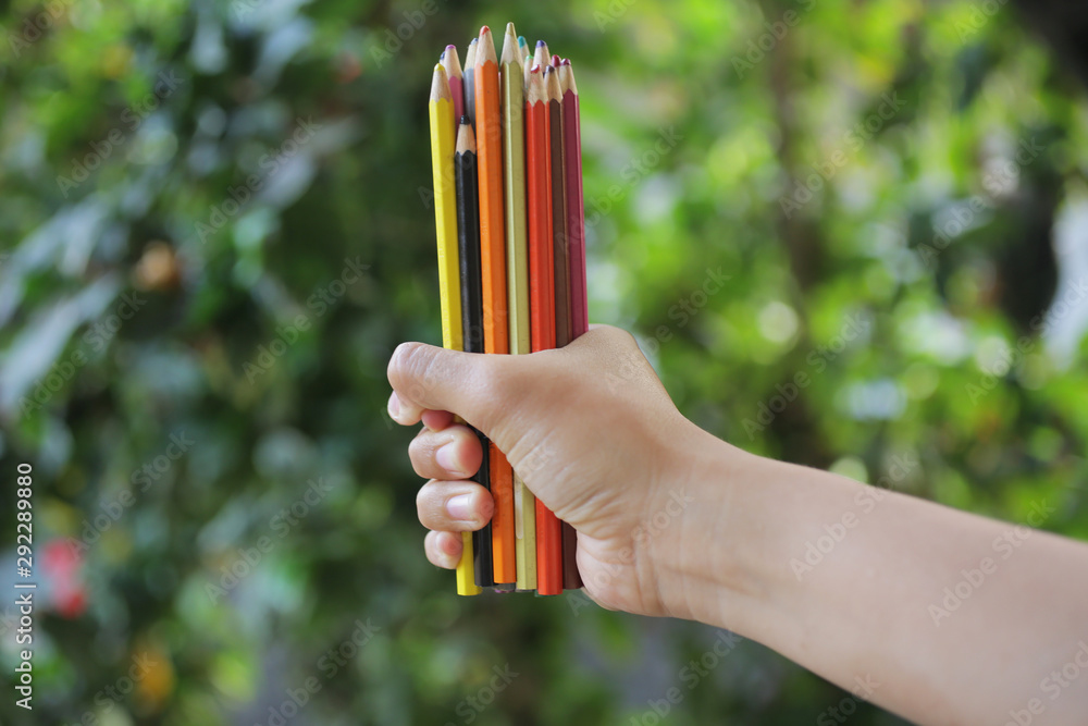 Bunch of colored pencil in hands. Blurry green garden background. Copy space.