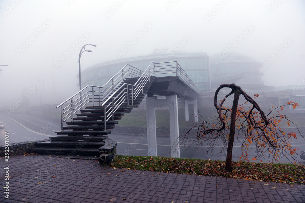 Autumn landscape- foggy autumn park alley with bare trees and dry fallen colorful leaves.