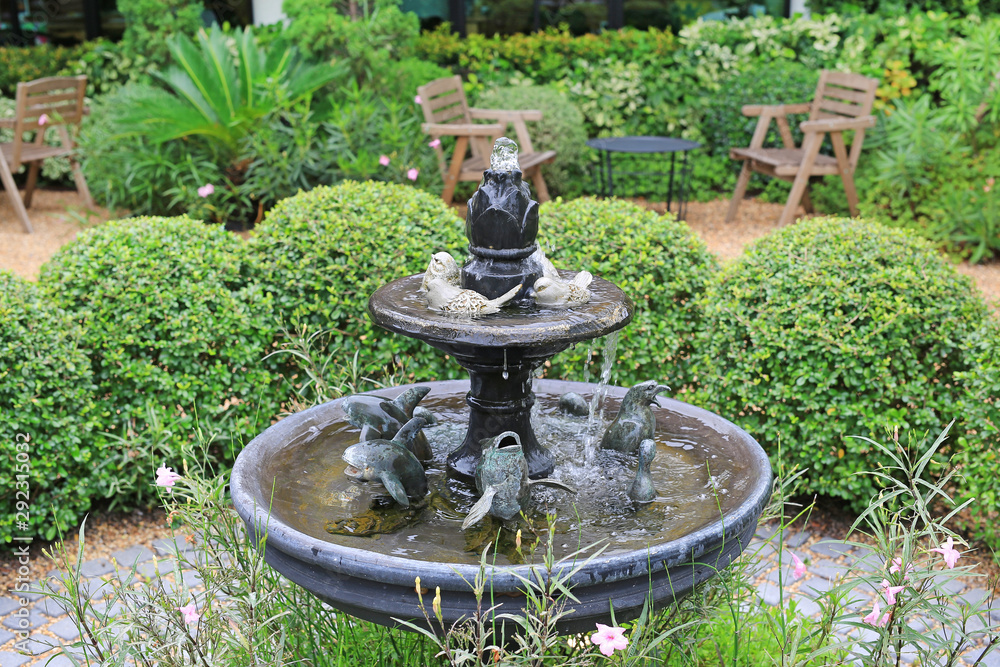 Beautiful Fountain in the park garden. Water flows from the fountain.