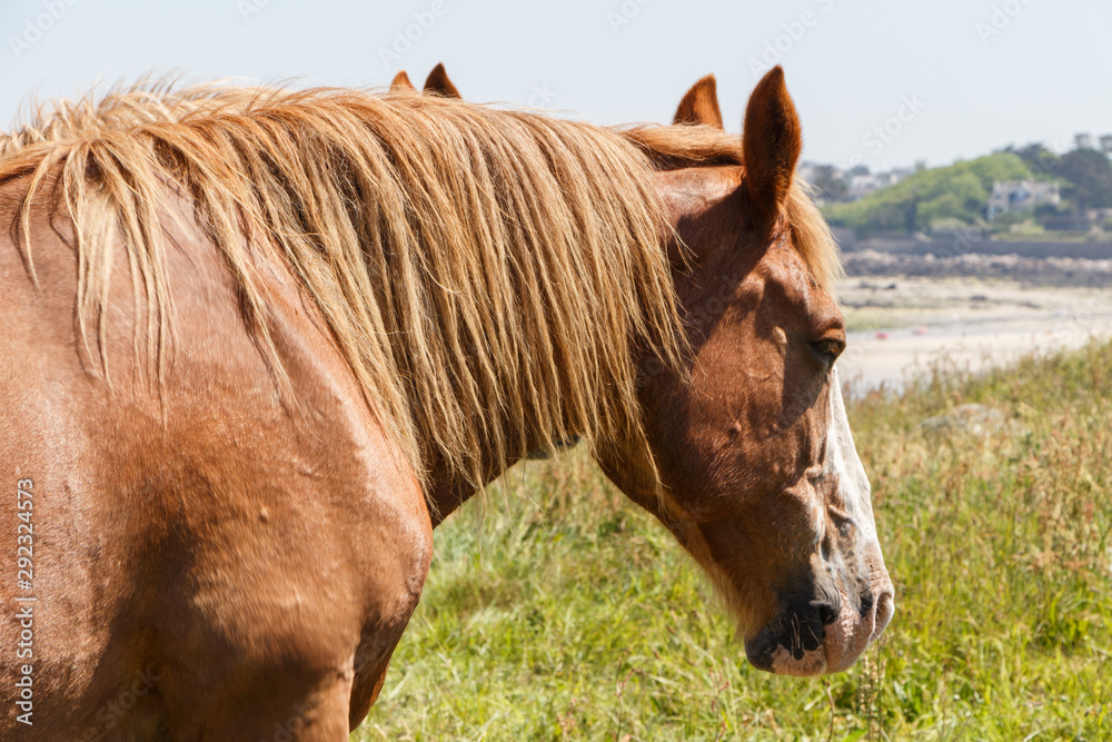 Chestnut Trait Breton horses in a field near the coast in Brittany