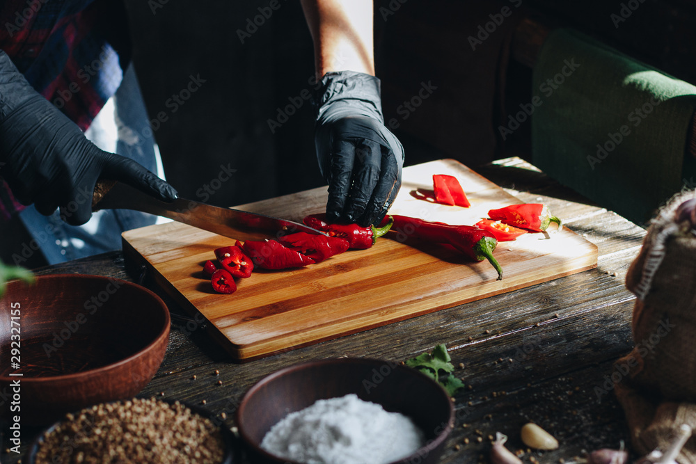 Woman hands in black gloves chopping red hot chili peppers