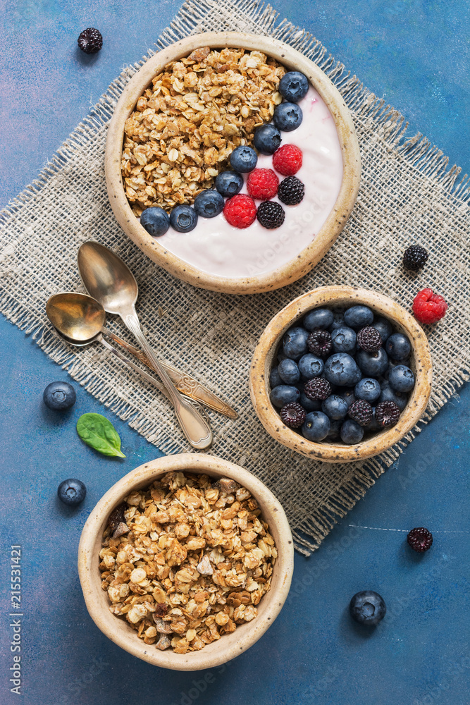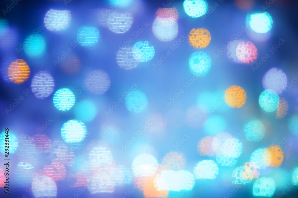 Abstract blue bokeh lights background. Blurred colored lights garlands. Beautiful Christmas and New Year background.