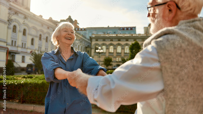 Happy together. Beautiful senior couple dancing and laughing outdoors