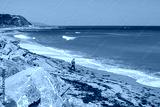 A fisherman fishing with a fishing rod on the coast of the Sea near the village of Okhotsk.