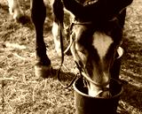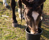 a horse drinks water from a bucket