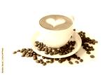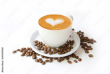 Coffee cup with latte art heart shape and beans isolated on a white background.