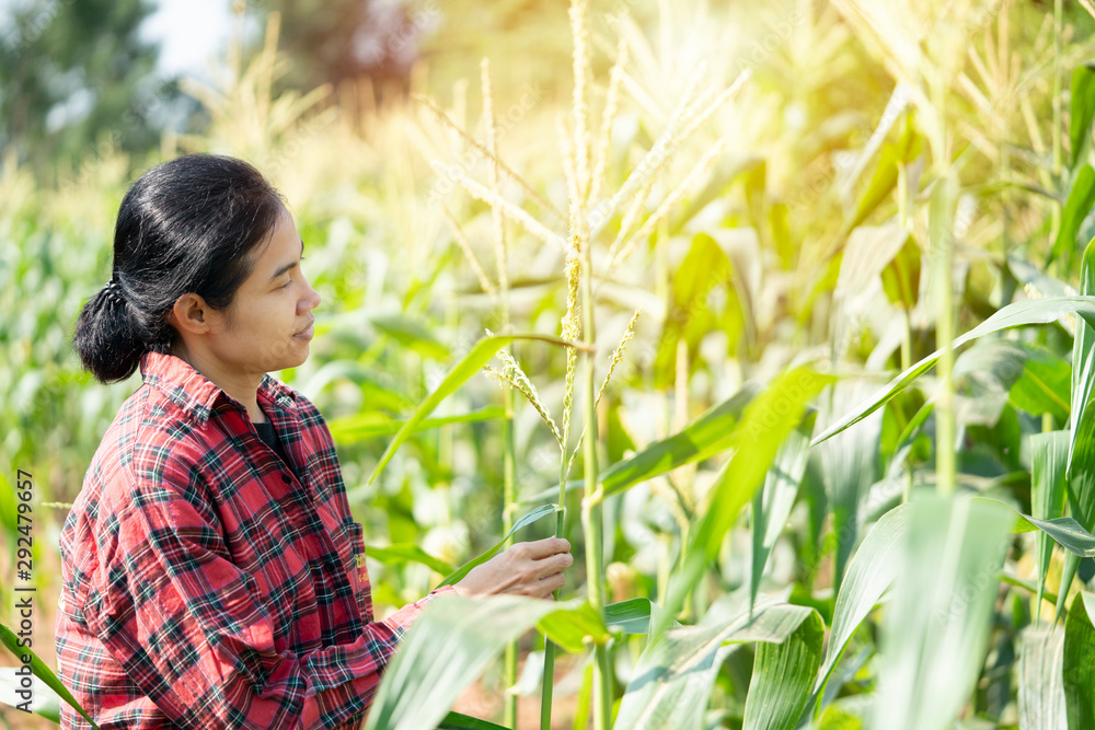 Asian farmer or engineer woman inspecting at her corn field summer sunny day