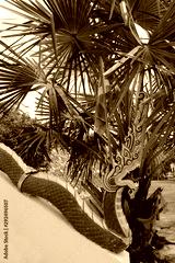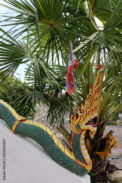 Detail of the end of a decorative stair railing sculpted in the form of a dragon at a Buddhist temple in Thailand with a background of tropical palm leaves.