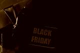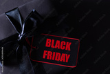 Top view of black christmas boxes with red paper tag on black background with copy space for text. black Friday composition.