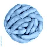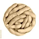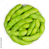 Edamame, green soybeans in the pod, in white bowl. Unripe soya beans, also Maodou. Glycine max, a legume, edible after cooking and rich protein source. Closeup, on white background, macro food photo.