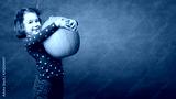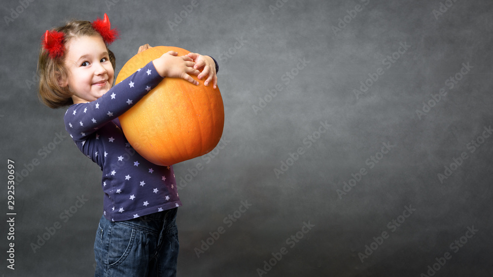 Halloween background with adorable child and space for your text. Little girl with costume horns having fun. Cute toddler holds big pumpkin and smiles. Studio portrait of cheerful kid on Halloween.