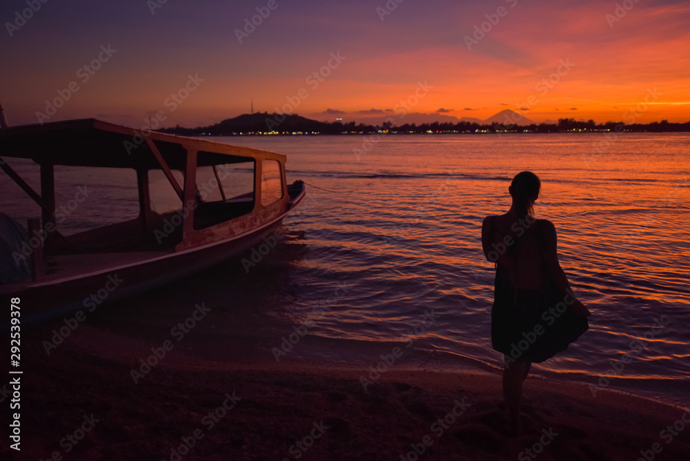 Young woman relaxing on the beach after sunset in Gili Meno, Indonesia