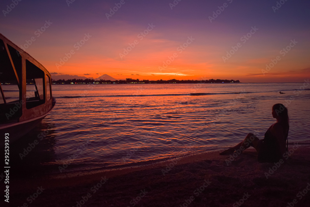 Young woman relaxing on the beach after sunset in Gili Meno, Indonesia
