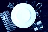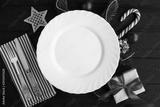 Empty white plate and Christmas composition on the black wooden background. Top view. Copy space.