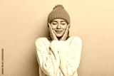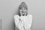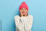 Portrait of lovely girl with pleased facial expression touches both cheeks, keeps eyes shut, wears pink hat and white sweater, enjoys winter time poses against blue background. People, feeling concept